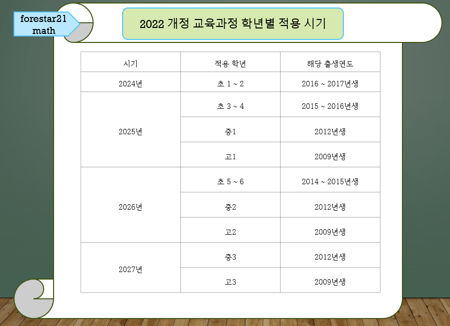 2025년부터 2022 개정교육과정이 실시되는 학년인 초등학교 3~4학년, 중학교 1학년, 고등학교 1학년의 공통, 일반 선택과목은 AI기반의 디지털 교과서를 사용합니다. 종합하면 2022 개정 교육과정 학년별 적용 시기는 초등학교는 1~2학년은 2024년, 3~4학년은 2025년, 5~6학년은 2026년도부터 적용되며 중, 고등학교는 2025년 1학년부터 적용됩니다.